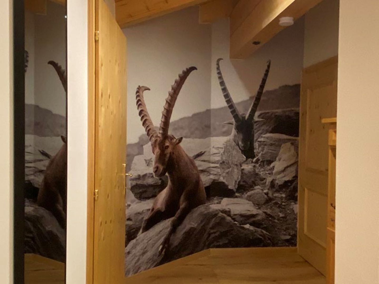 Das Chalet verfügt ebenerdig über einen großen Eckbalkon zum Sonnenaufgang nach Süd-Osten, wobei man den Sonnenaufgang sowie am Abend die imposanten angestrahlte Bergkulisse bestaunen kann.