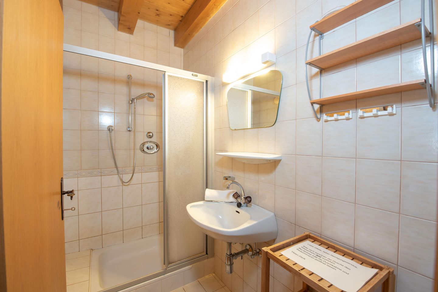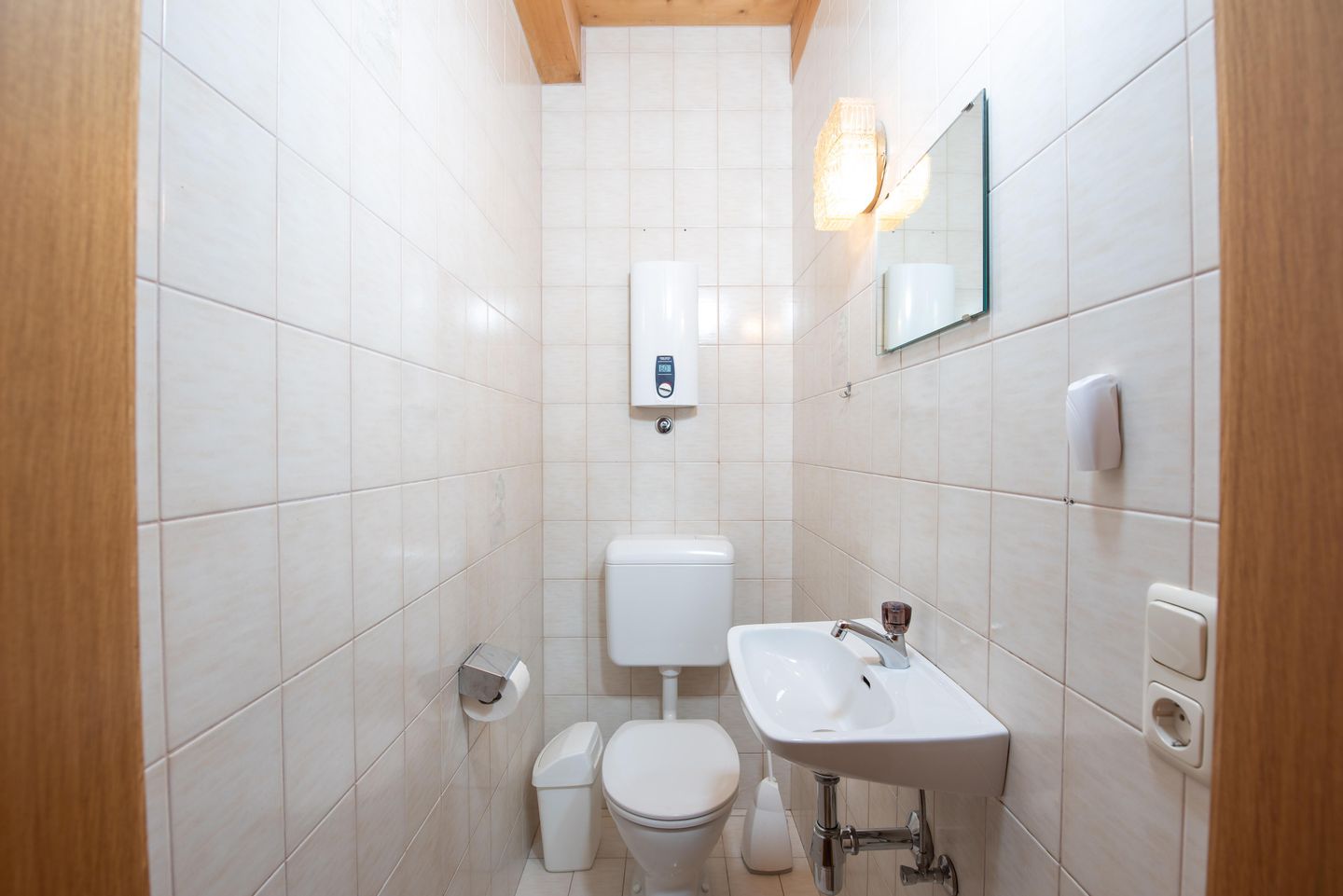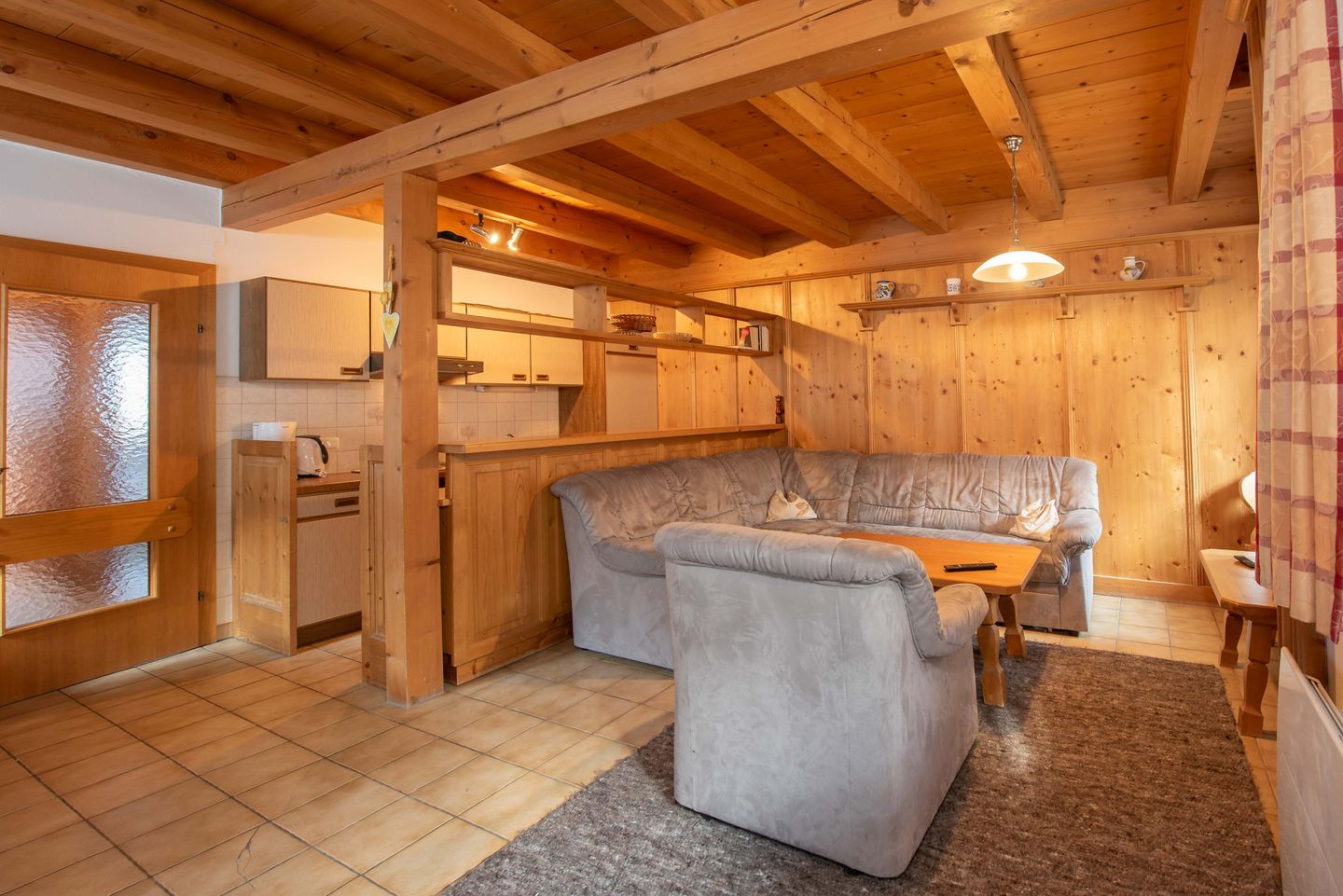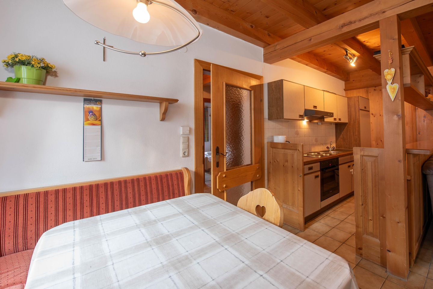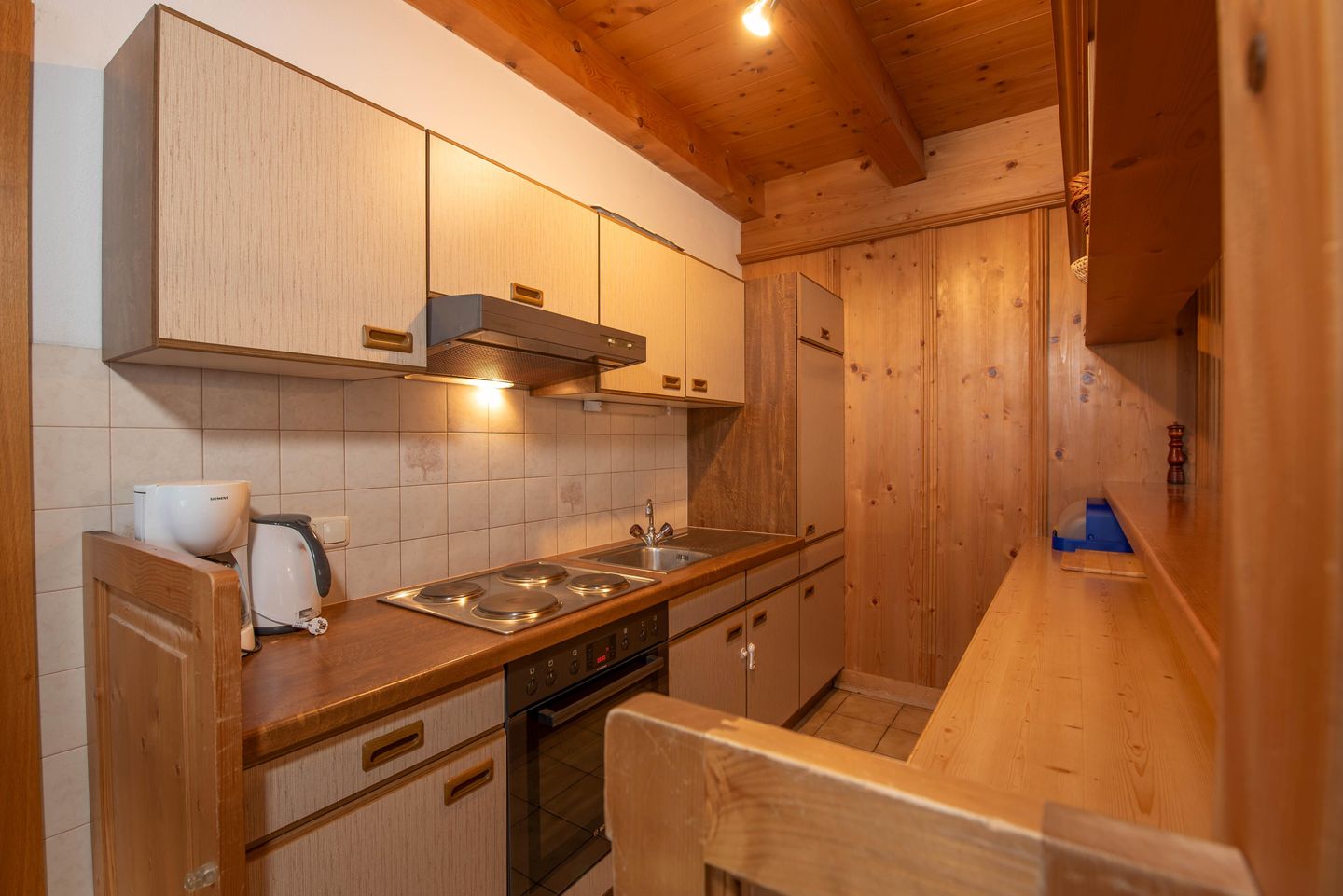 De goed uitgeruste open keuken biedt meer dan alleen de mogelijkheid om kleine snacks te bereiden. De rustiek-gezellige eethoek is perfect voor familieavonden.